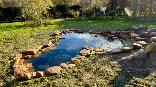 The completed pond now sits seamlessly within the garden landscape, looking as though it has always belonged there. With natural stone edging, layered planting shelves, and wildlife-friendly access points, it provides everything needed for a thriving, self-sustaining ecosystem.